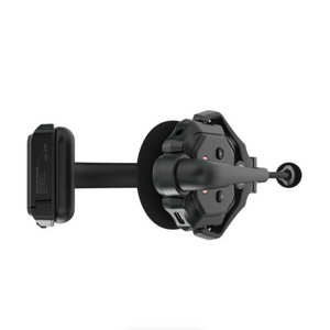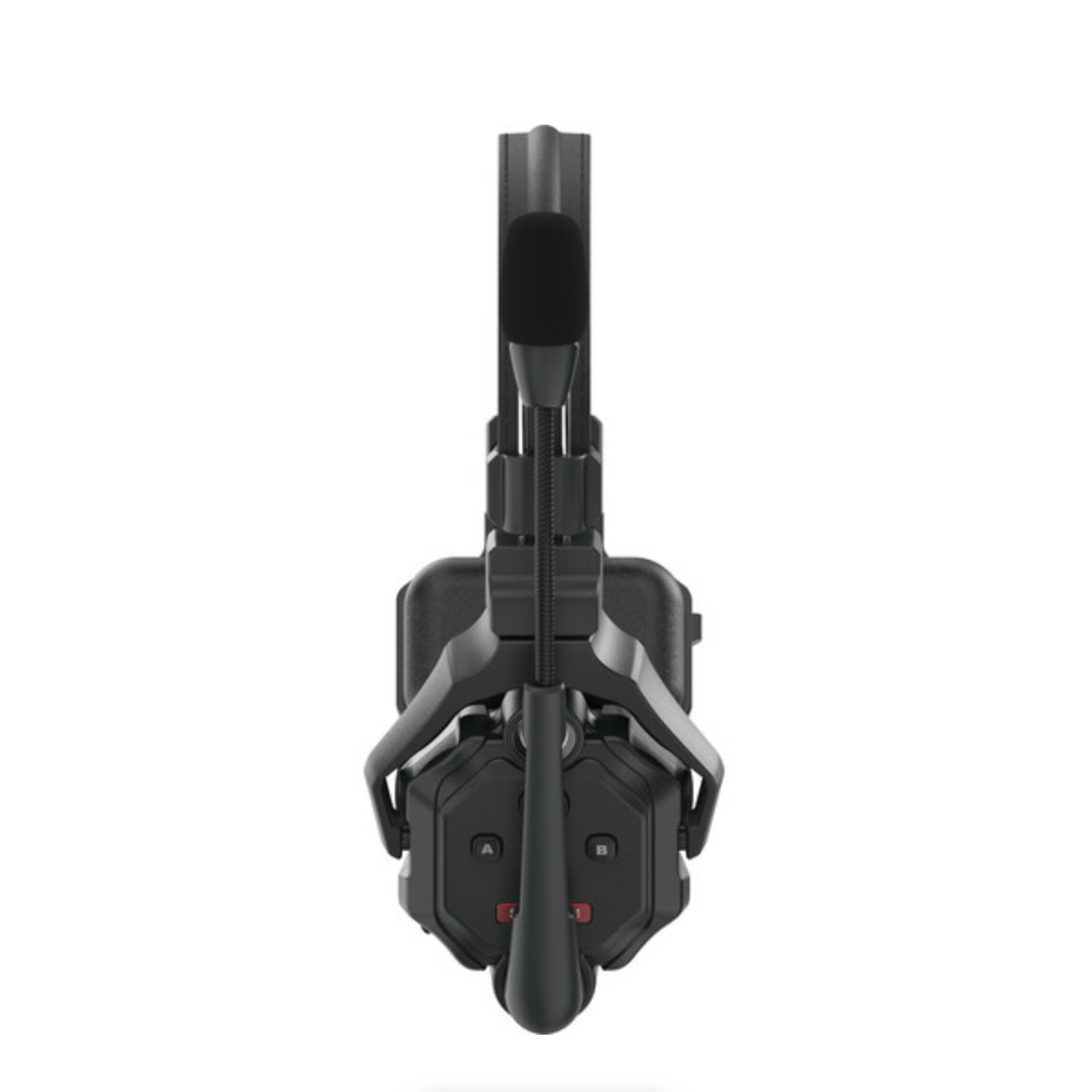 The headsets pair up automatically, and tactile volume buttons allow for fast adjustments—making the system easy to operate. The microphone boom on each headset rotates 360°, allowing for left or right orientation. Rotating the boom arm up or down conveniently mutes the mic when not in use. An LED indicates the system is working and warns you when the battery is low.