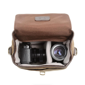 The Bond Street Waxed Canvas Camera Bag in olive from ONA is a stylish carrying option that can accommodate a mirrorless camera with one or two lenses and additional personal items. For impact and shock protection the bag has a padded non-scratch interior with closed-cell foam. A touch-tab divider can be adjusted to create two interior sections of equal or varying lengths. With or without that insert, the Bond Street bag can also be used as a compact messenger bag.