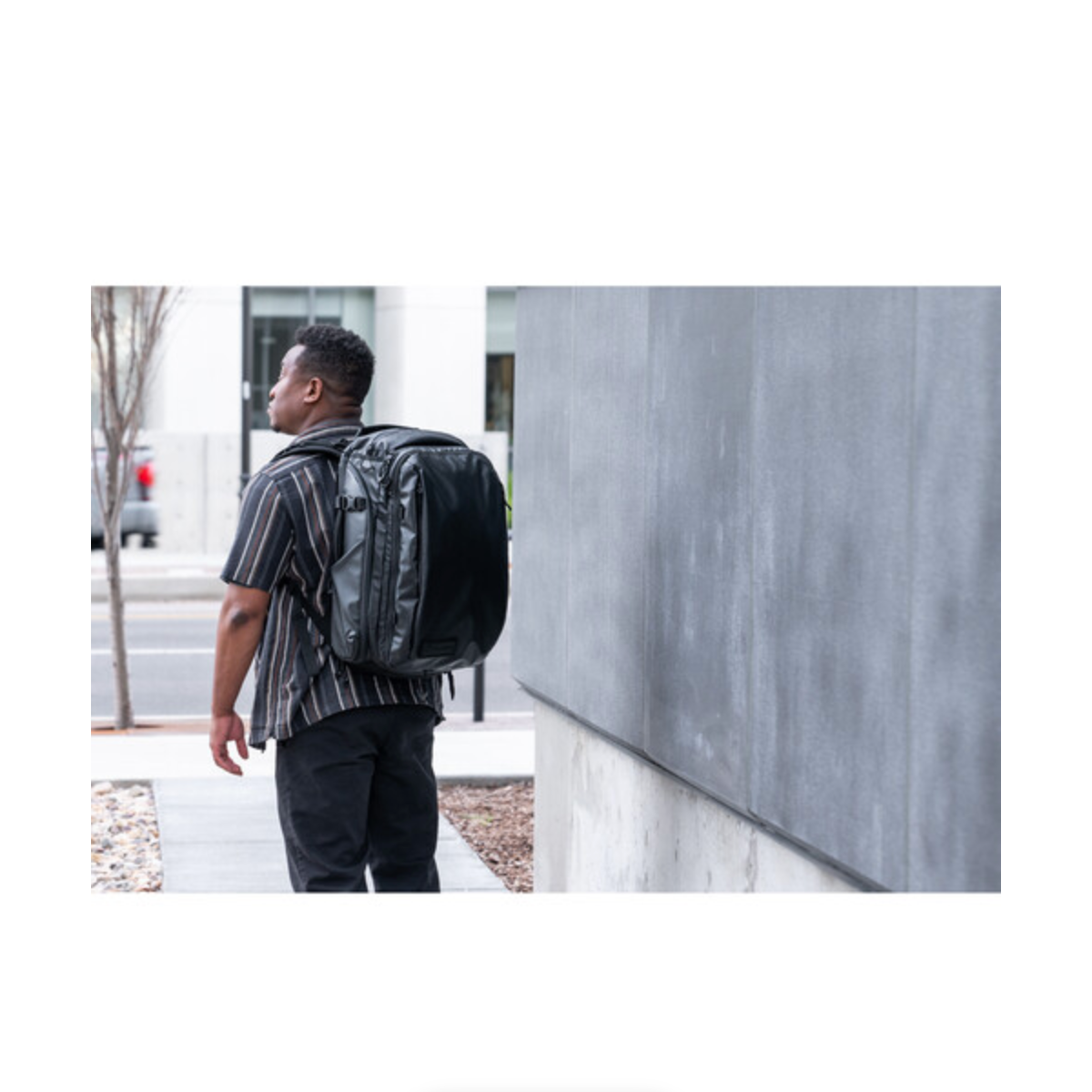 The black, 35L Transit Travel Backpack from WANDRD holds enough clothing and gear for three to five days and is comfortable enough for all-day use. A rear pocket stores your laptop or tablet, and there are straps to attach accessories to the exterior. The sides unzip to add an additional 5 liters of capacity, and the shoulder straps can be stowed away when not in use.