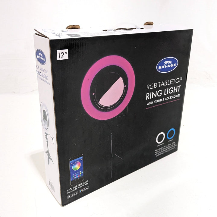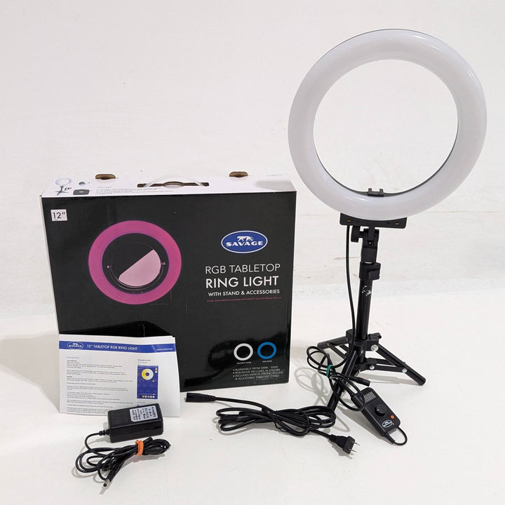 INCLUDED: DEMO Savage 12" Bi-Color RGB Tabletop Ring Light with Stand