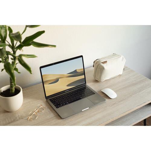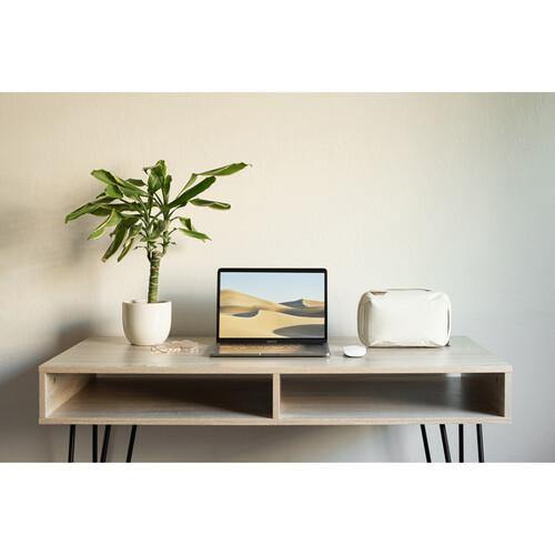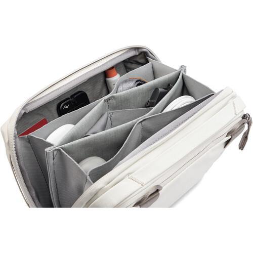 The Peak Design Travel Tech 2L Pouch, in off-white bone, is part of a compartment system that enhances your ability to organize the contents of a Peak Design Travel-Series bag. Specifically designed for electronics accessories, it features a water-resistant zipper and a clamshell configuration with fifteen internal organizational pockets to hold a range of devices such as batteries, memory cards, portable hard drives, cables, and power adapters. Internal and external zippered pockets along the length of the pouch give you additional storage for your passport, a smartphone, folded documents, or pens. If you have a power bank to keep your gear charged, there is a power cord pass-through leading from the interior and through the external zippered pocket so you can access it without having to remove it from the pouch.