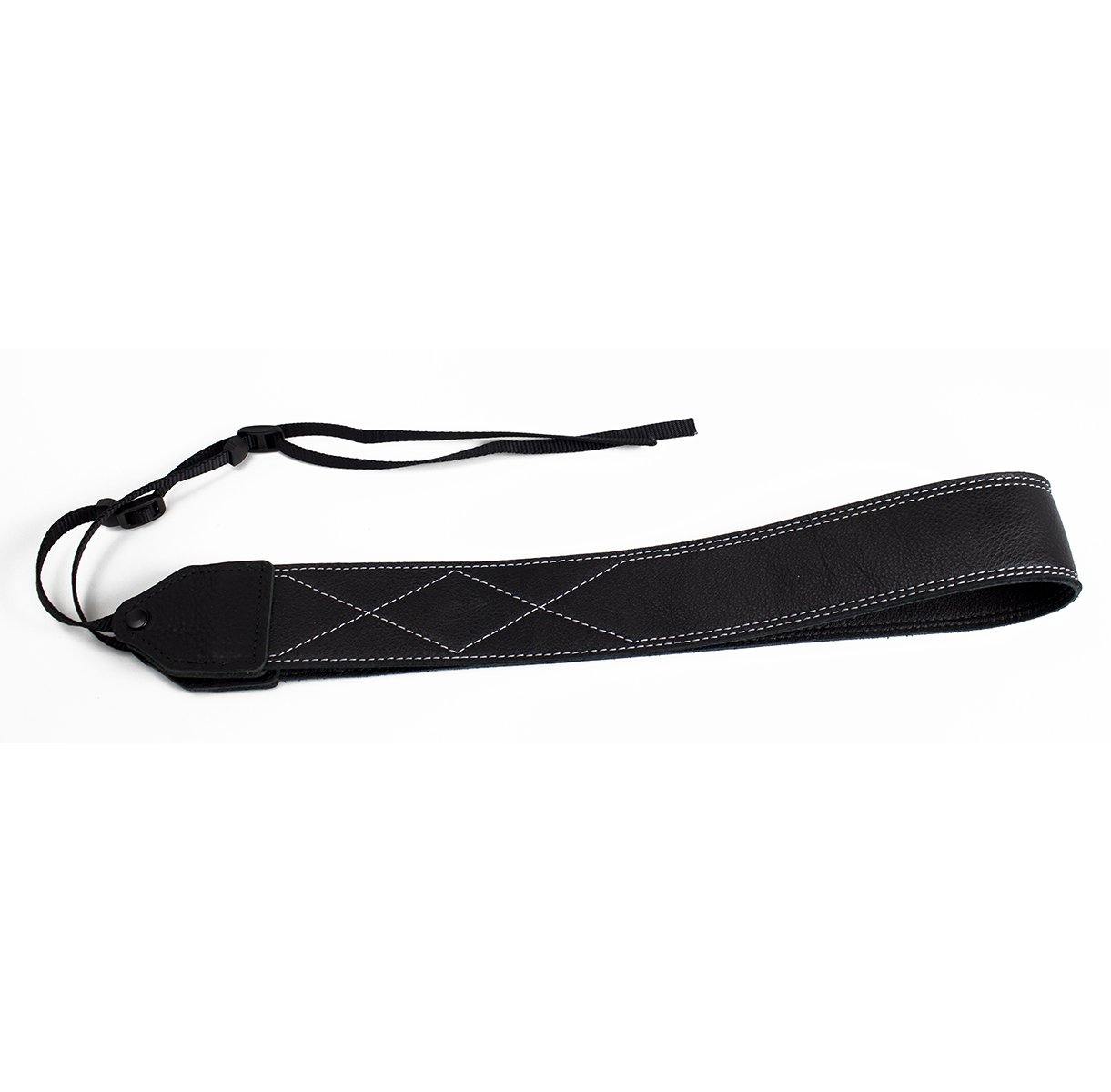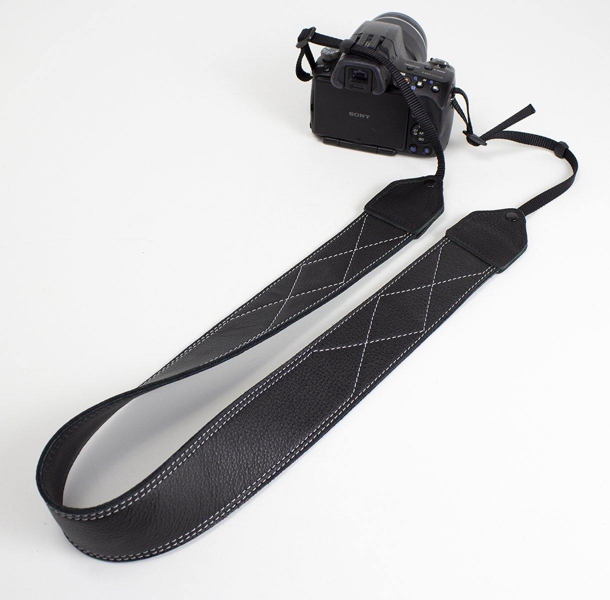 - Black / white stitched leather camera strap. This camera strap has 2 points of attachment and can easily be connected to your camera.