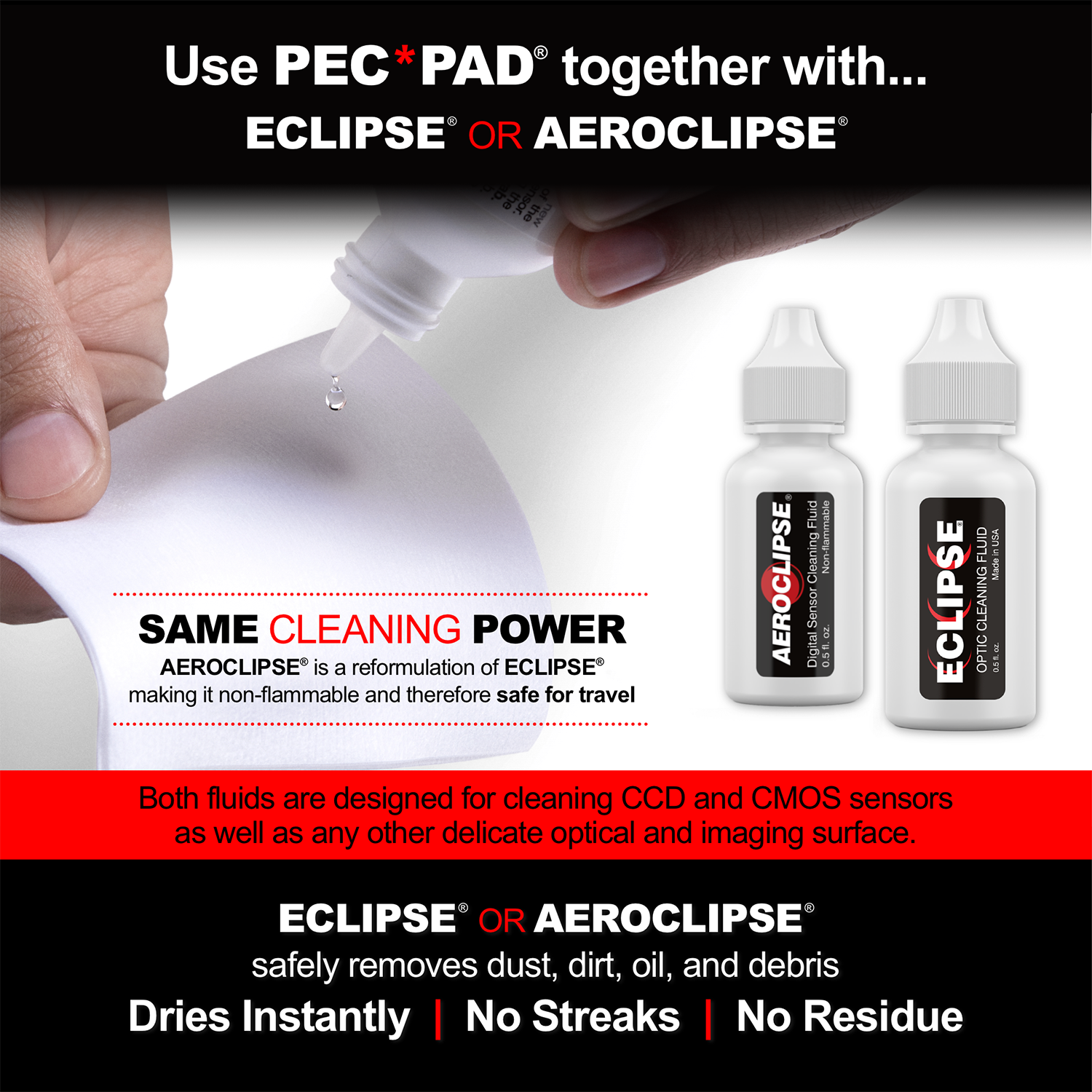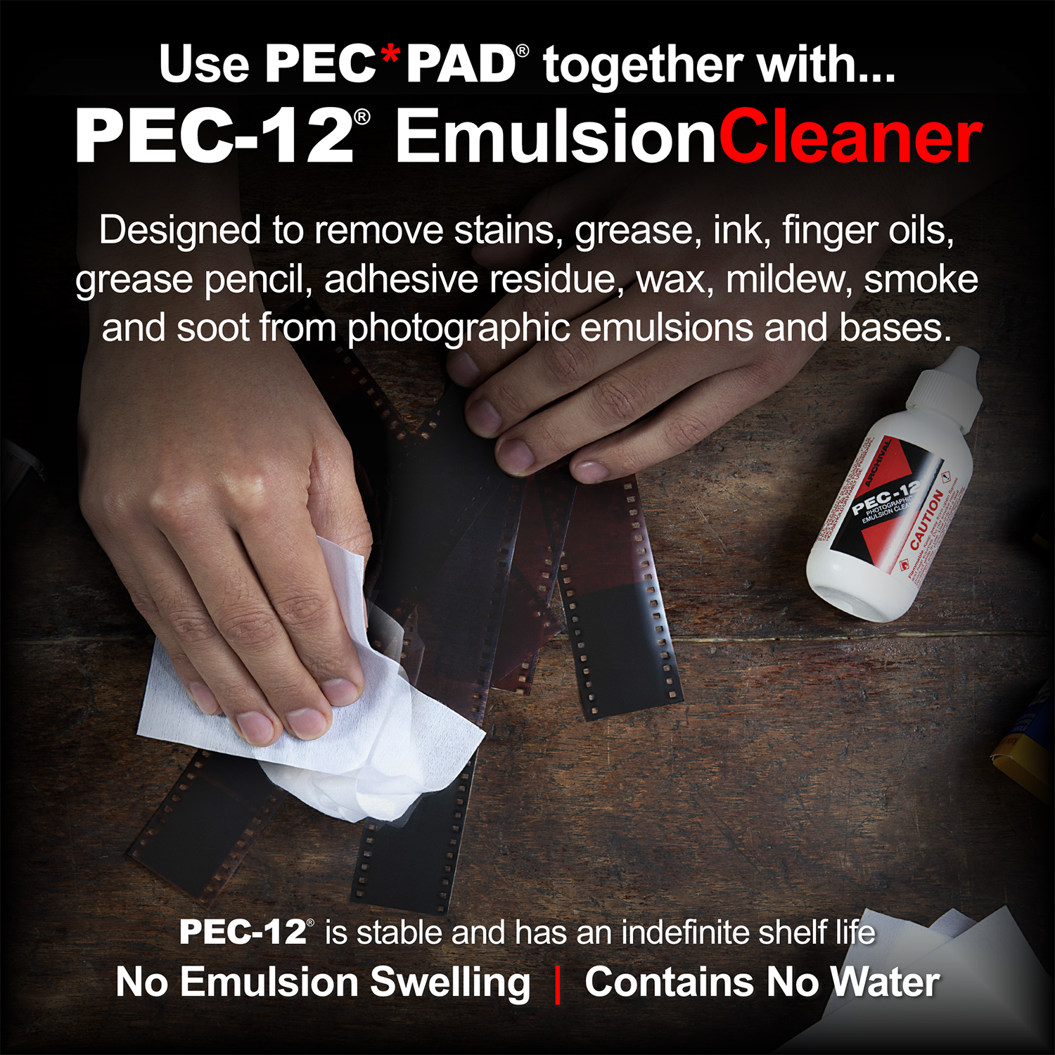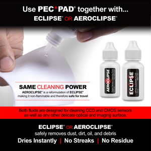 The PEC-PADs can also be combined with optional Photographic Solutions PEC-12 photographic emulsion cleaner, ECLIPSE optic cleaning fluid, or AEROCLIPSE digital sensor cleaning fluid, as needed.