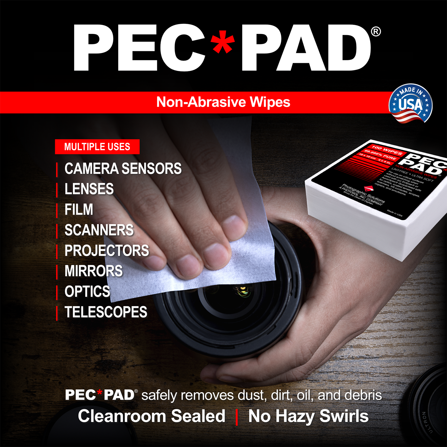 - PEC*PADs are strong, lint-free pads that are well-suited to cleaning a wide variety of sensitive surfaces, such as scanners, CDs, mirrors, lenses, telescopes, and more, as well as films and emulsions when used in conjunction with PEC-12 cleaning solution.