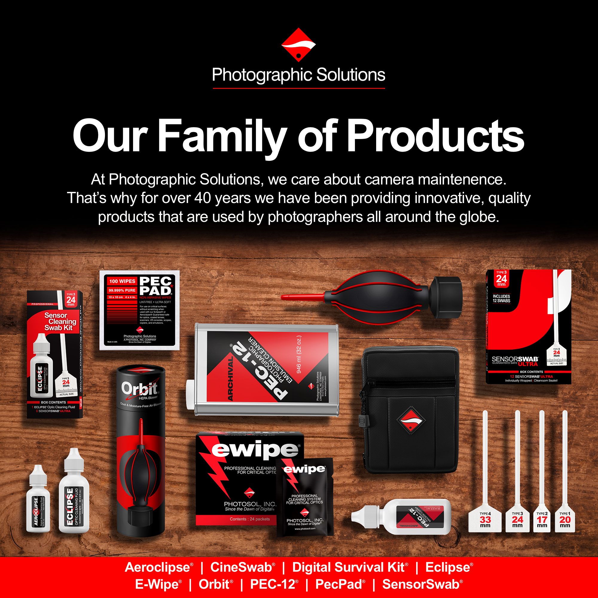 Combining all of the necessary tools to keep your camera's sensor clean, this Sensor Swab ULTRA Kit from Photographic Solutionsincludes four Type 2 Sensor Swabs ULTRA, 10 PEC*PADs, 1 e-Wipe Pad packet, and a 0.5 oz bottle of Eclipse Optic Cleaner, all of which is neatly packed inside a nylon zippered travel pouch. The included Type 2 individually wrapped Sensor Swabs ULTRA are pre-moistened with ECLIPSE Optic Cleaning Fluid, and specifically designed for image sensors measuring 17mm high, such as DX or APS-C sensors.