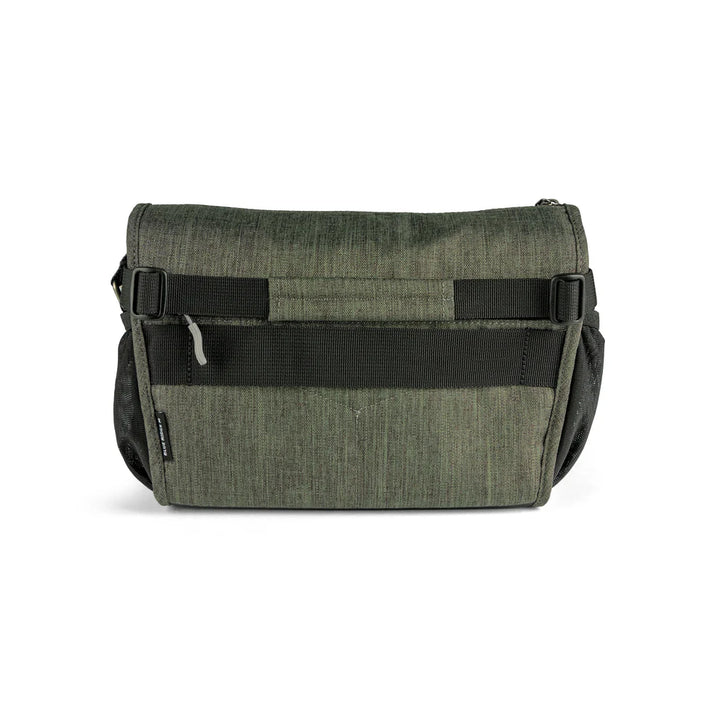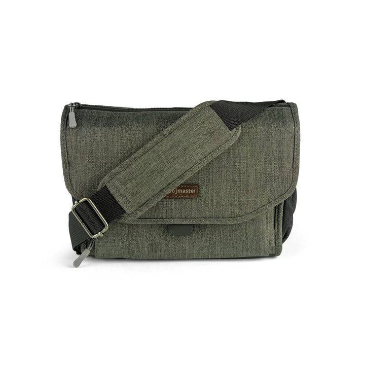 A beautiful, mottled green color, over-the-shoulder camera bag with lots of storage space for its size, and a nifty magnetic latch. This medium size bag can hold a mirrorless camera or DSLR with 1 to 3 lenses, speedlight, and accessories.