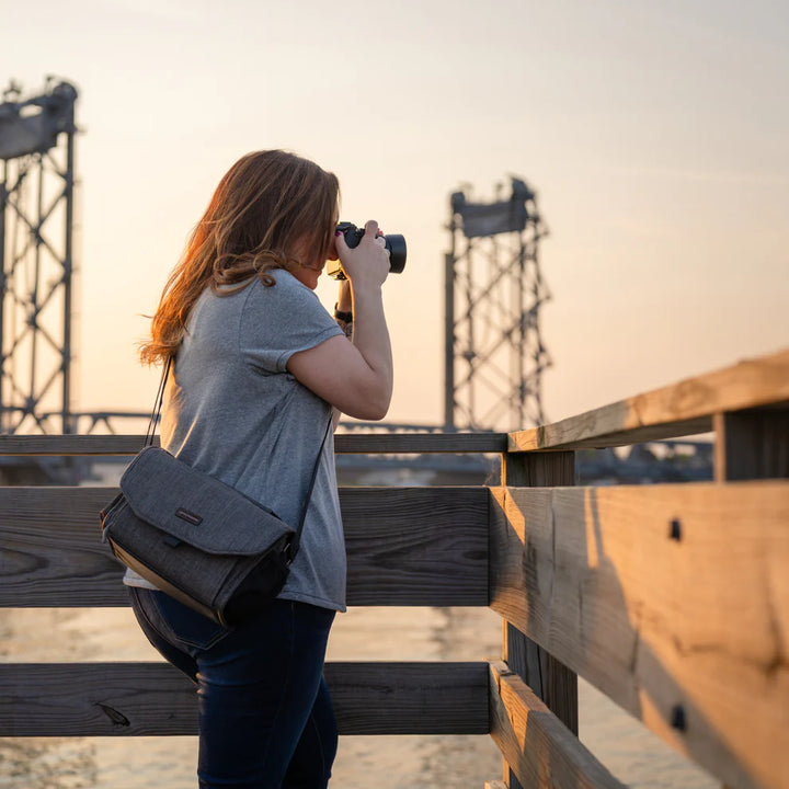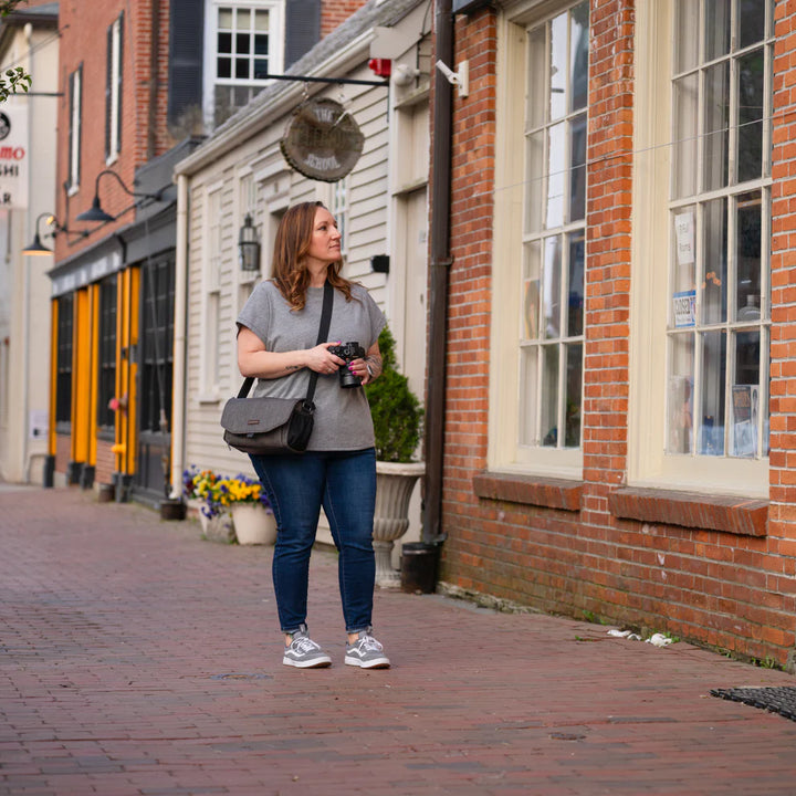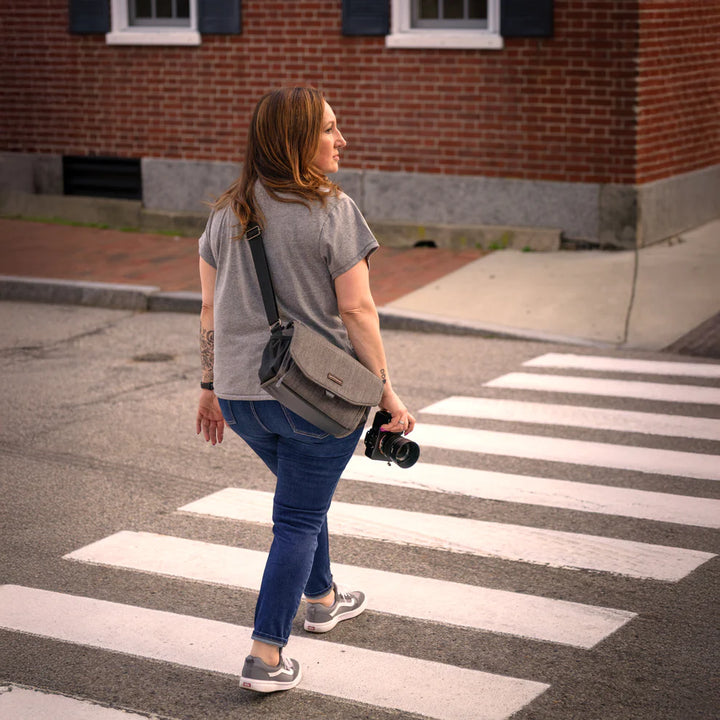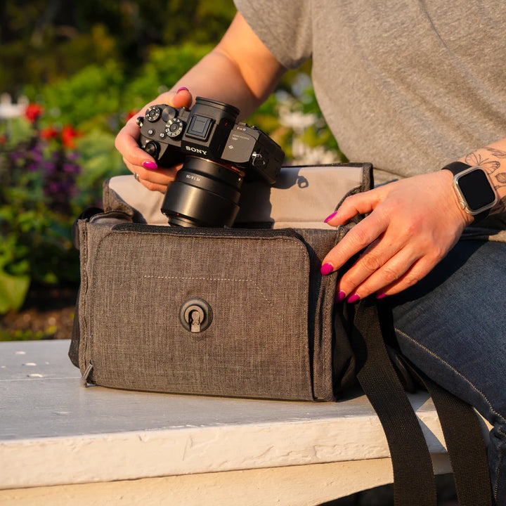 A beautiful, mottled green color, over-the-shoulder camera bag with lots of storage space for its size, and a nifty magnetic latch. This small size bag can hold a small mirrorless or DSLR camera with 1 or 2 lenses, speedlight, and accessories.