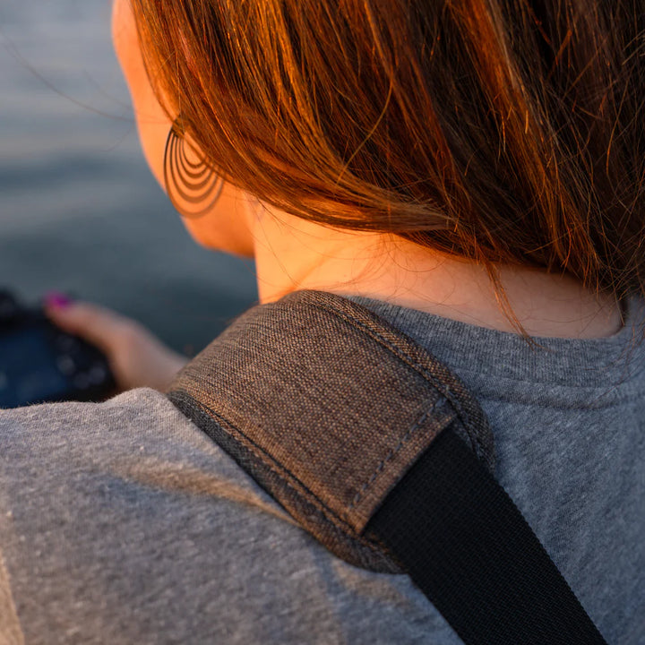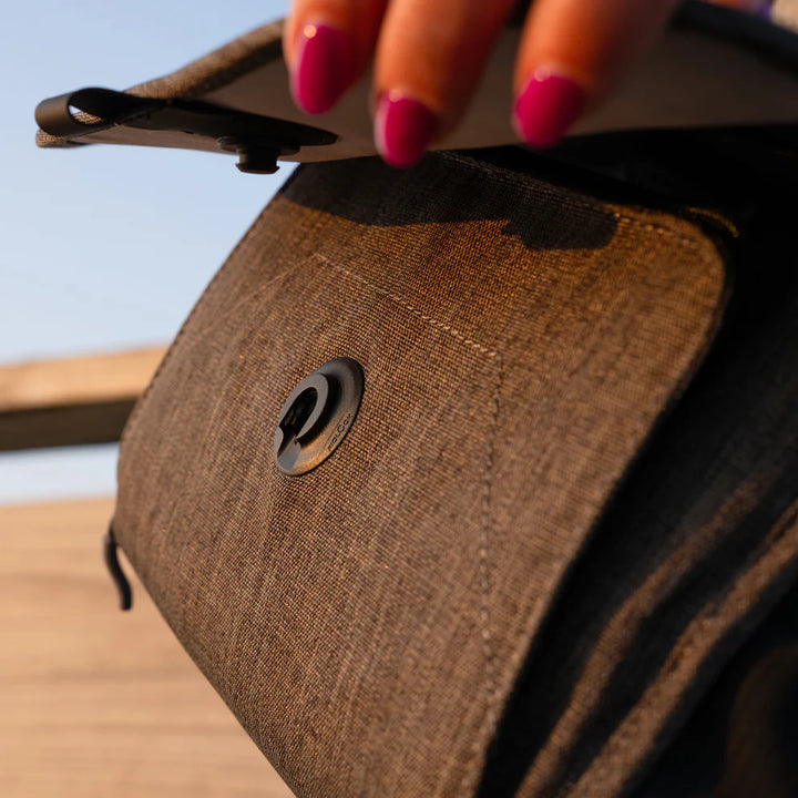 The main flap is latched with a fast-action magnetic Fidlock® latch. Simply tug down on the front flap of the bag to undo the latch. The flap will snap itself securely closed when you return it to its resting position. Alternatively, you can unzip the top of the bag for direct access to the main camera compartment.