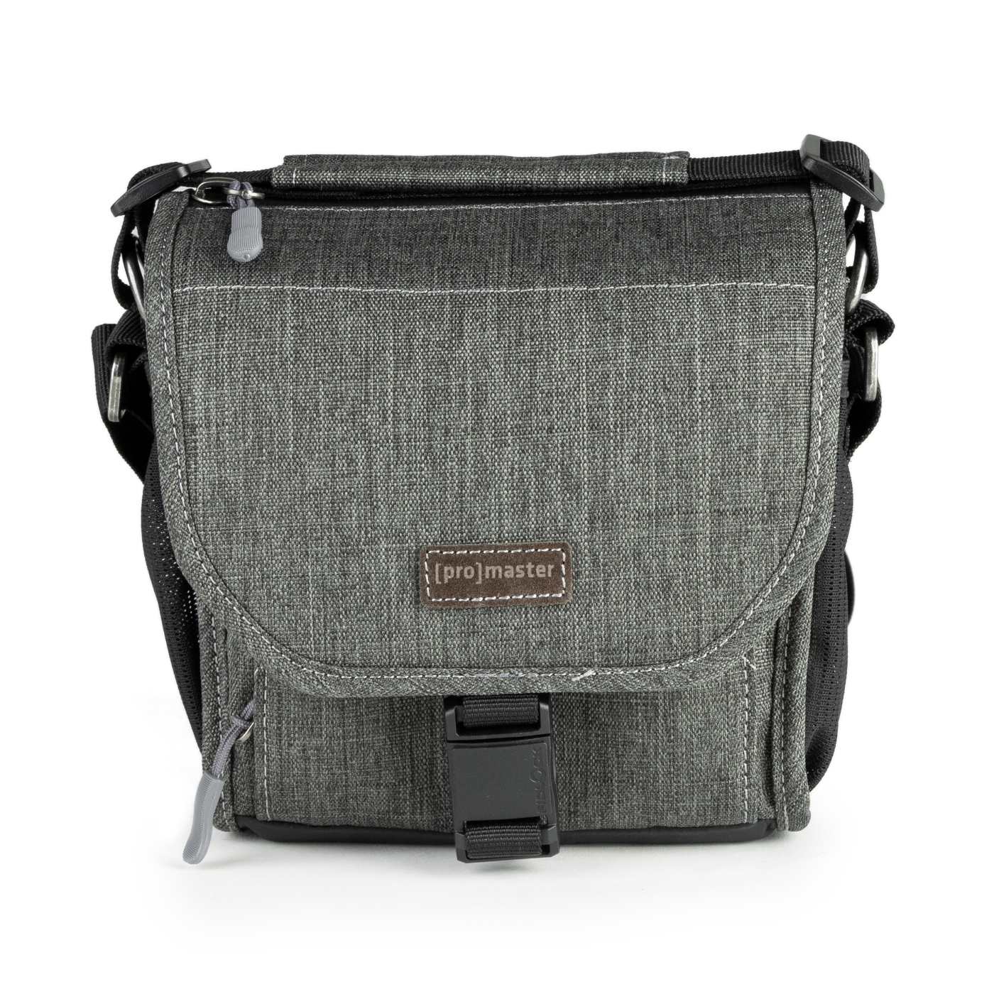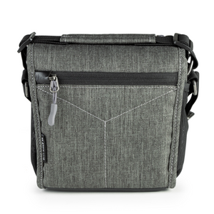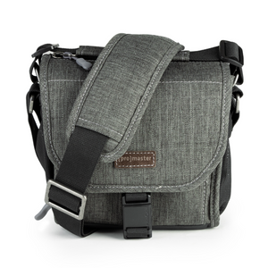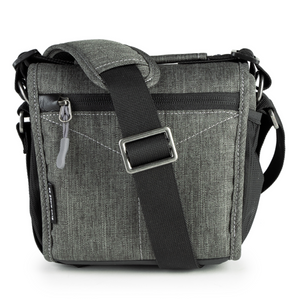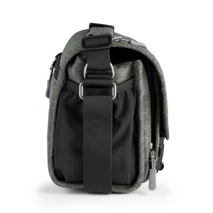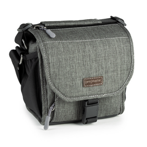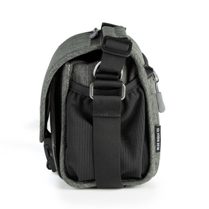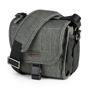 A beautiful, mottled green color, over-the-shoulder camera bag with lots of storage space for its size, and a nifty magnetic latch. This extra small size bag can hold a point-n-shoot or small mirrorless camera with 1 or 2 small lenses and accessories.