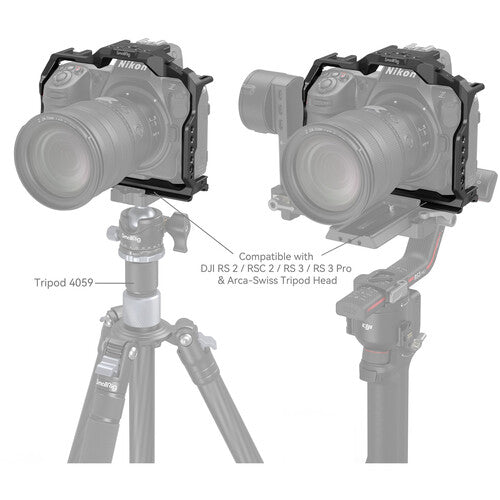 This lightweight aluminum Camera Cage from SmallRig protects and provides accessory mounting for your Nikon Z8 camera. This formfitting cage maintains access to all the camera's controls, battery, and SD card slots, and it features a variety of mounting options. The camera secures onto the cage using a 1/4"-20 camera screw with a locating pin, and a side locking adapter further prevents twisting.