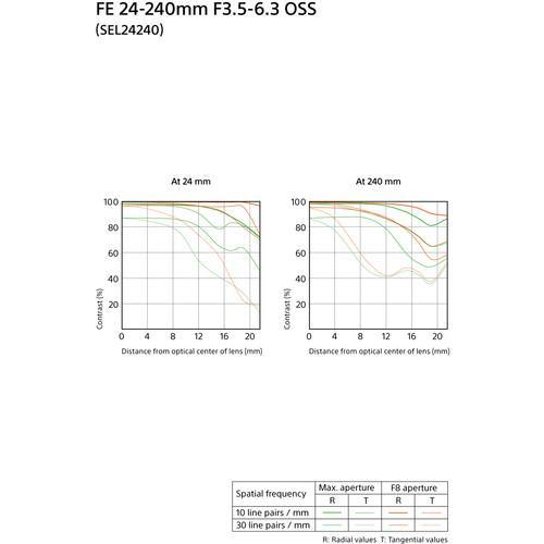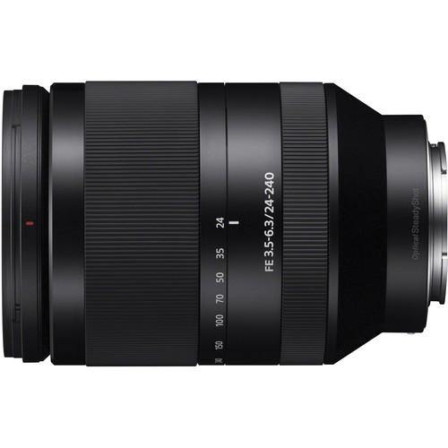 The FE 24-240mm f/3.5-6.3 OSS Lens from Sony is a full-frame compatible E-Mount telephoto zoom lens with the versatility to stretch from true wide-angle to super telephoto perspectives. Its advanced optical design includes 5 aspherical elements and 1 ED glass element, achieving high-quality performance with reduced chromatic and spherical aberrations in a compact design. Optical SteadyShot image stabilization facilitates sharper imaging in low light situations and when shooting at long telephoto lengths.