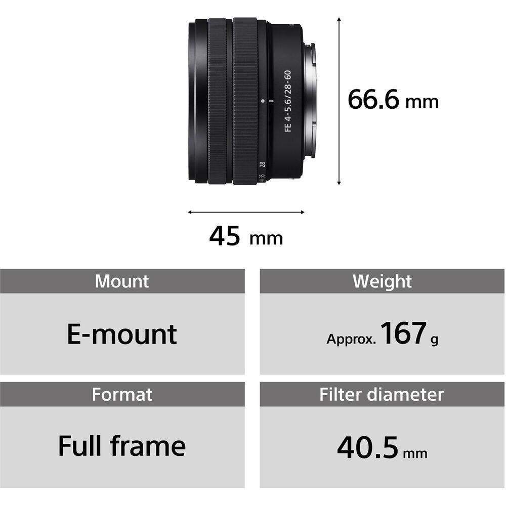 Impressively compact and versatile, the Sony FE 28-60mm f/4-5.6 is a wide-angle to long-normal zoom characterized by its retractable design and sleek profile. The svelte design makes this lens ideal for walkaround, everyday shooting, and the flexible focal length range benefits a wide range of subject types. The optical design incorporates three aspherical elements, which help to reduce distortion and spherical aberrations and promote greater sharpness and accurate rendering. Complementing the optics is a linear motor and internal focusing design, which achieve quick and quiet autofocus performance for both photo and video needs. The lens body is also weather-sealed to permit working in trying environmental conditions.