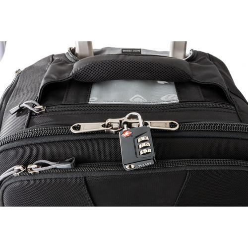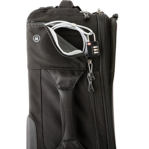 The bag has four sets of dual inline-skate style wheels that rotate, allowing the bag to easily roll sideways through aisles or through people in crowds. It also includes a cable and a lock for locking the zipper and securing the bag to a post. A rain cover is included to protect your gear in inclement weather.