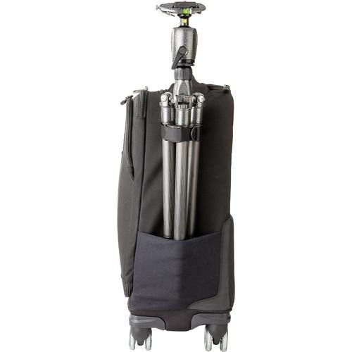 The Airport Roller Derby Rolling Carry-On Camera Bag from Think Tank Photo features a customizable interior that can hold up to two DSLRs with lenses attached or one pro sized DSLR with a lens attached, as well as additional lenses, flashes, and accessories and depending on the configuration, the bag can hold up to a 400mm f/2.8 lens, unattached. The bag also has two dedicated padded pockets for a tablet and a 15" laptop.