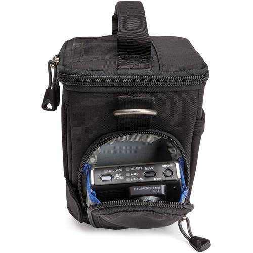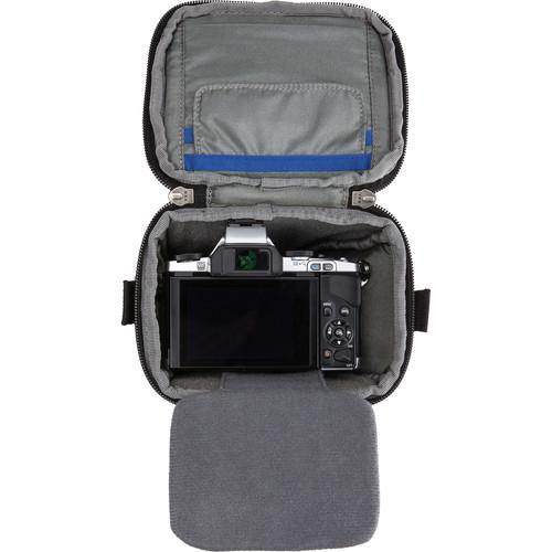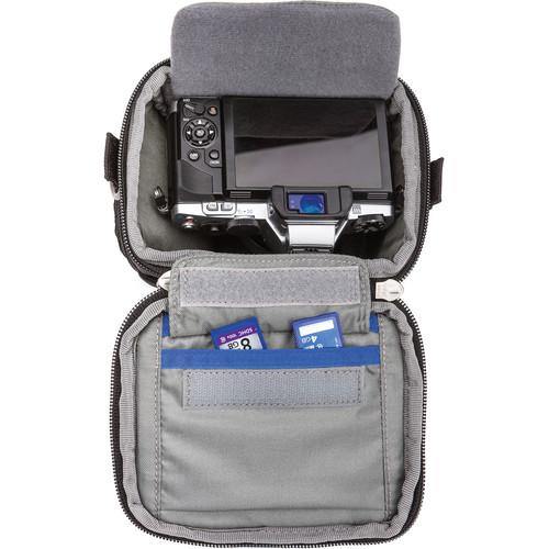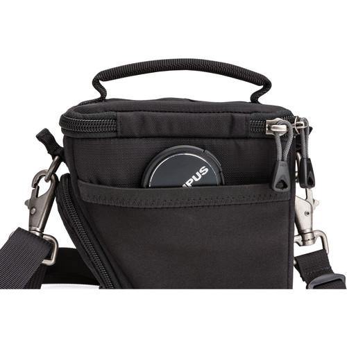 A camera placed inside the Digital Holster 5 can be easily removed using the quick-access top opening. A front stretch pocket can hold lens caps, back caps, and other small accessories. For larger accessories such as lens hoods, flashes, or filters, a zippered side pocket is provided. On the outside of the top lid is a compartment for business cards, while on the inside of the top lid is a pocket that can be used to safely store memory cards or a lens cloth. To protect a camera's rear screen while it is in the Digital Holster 5, a removable screen protector is included to provide a buffer against potential abrasion from shoulder straps that are connected to the camera and are tucked into the bag as well.