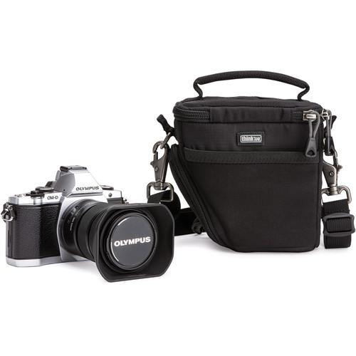 The Digital Holster 5 from Think Tank is a holster-style bag with closed-cell foam cushioning that is designed to fit a small to medium mirrorless camera along with an attached lens measuring up to 3.3" (8.4 cm) long. This bag offers a variety of carrying options, including a top handle, an included shoulder strap, as well as the ability to mount it onto a modular Think Tank bag, beltpack, or belt. Additionally, it can be mounted to a standard belt.
