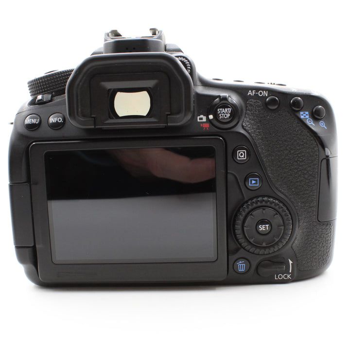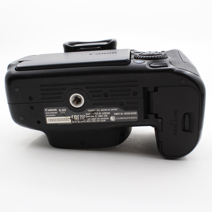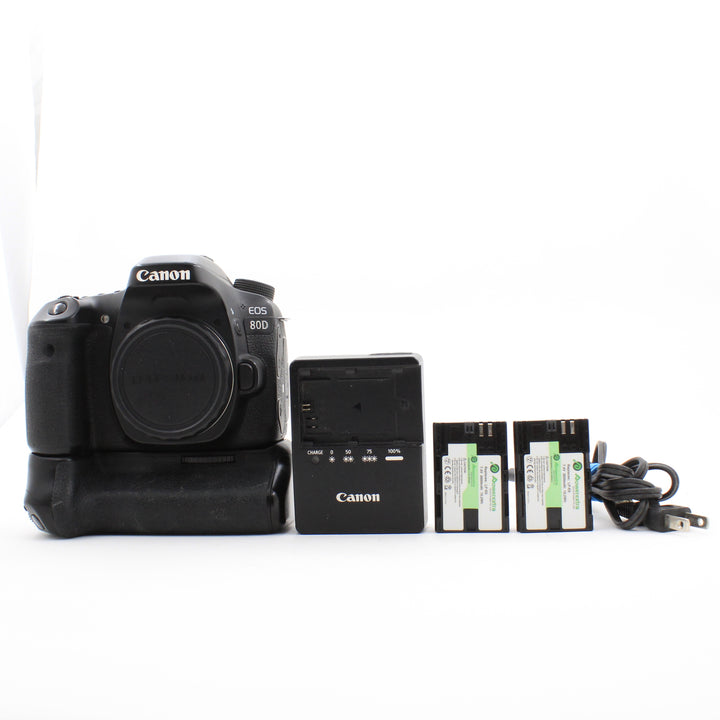 INCLUDED: USED Canon 80D Body with 3rd Party Battery Grip, (2) 3rd Party Batteries, Canon LC-E6 Charger, Eyepiece, and Camera Body Cap