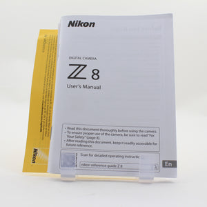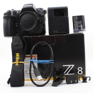 INCLUDED: USED Nikon Z8 Mirrorless Camera Body, Nikon EN-EL 15c Battery, Nikon MH-25a Charger, USB-C Cable, Cable Tensioners, Eyepiece, Nikon Strap, User's Manual, Original Packaging, and Product Box