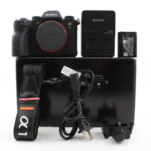 INCLUDED: USED Sony a1 Mirrorless Camera Body Only, Sony NP-FZ100 Battery, Sony BC-QZ1 Charger, Eye Cup, Hot Shoe Cover, Body Cap, Strap, Cable Restraint, and Product Box